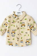 Açık bej zemin üzerine yerleştirilmiş kamp temalı desenler; otobüsler, şapkalar, gözlükler, bayraklar ve “CAMP FRIEND” yazılarıyla çocuklara neşeli ve maceracı bir hava kazandırır.